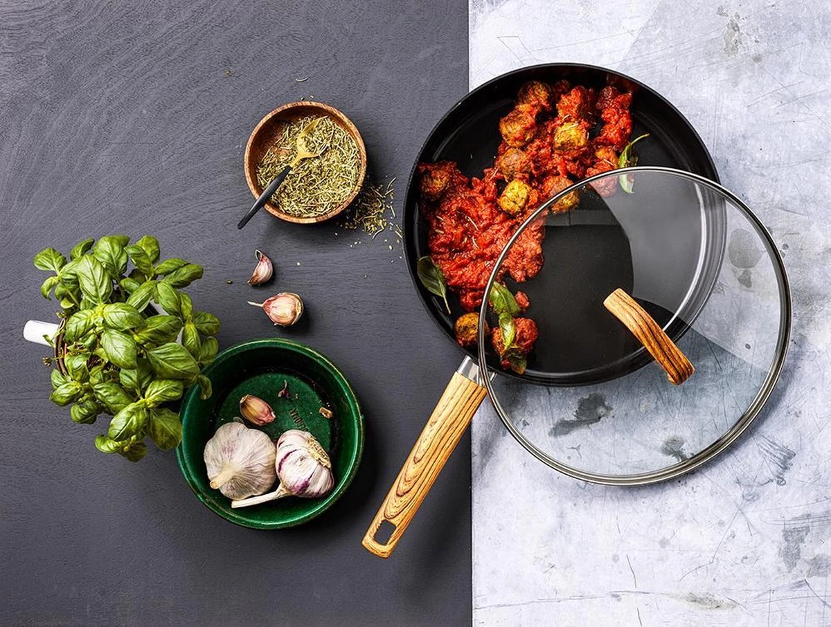 Deze PFAS-vrije Gero Mark Aluminium Hapjespan met deksel – 28cm staat stoer op het fornuis en op tafel. De zwarte kleur van de pan en de hout-look grepen geven de pannen een strak design. De pannen hebben een non-stick coating, waardoor koken extra leuk wordt! Je gerecht blijft niet kleven in de pan.
